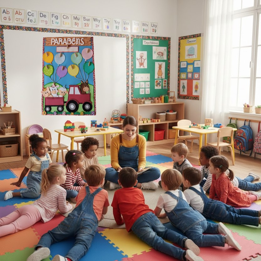 Kit Sala de Aula Fazendinha – Cartaz Parabéns, recurso pedagógico em EVA (Emborrachado), usado como item na decoração.
