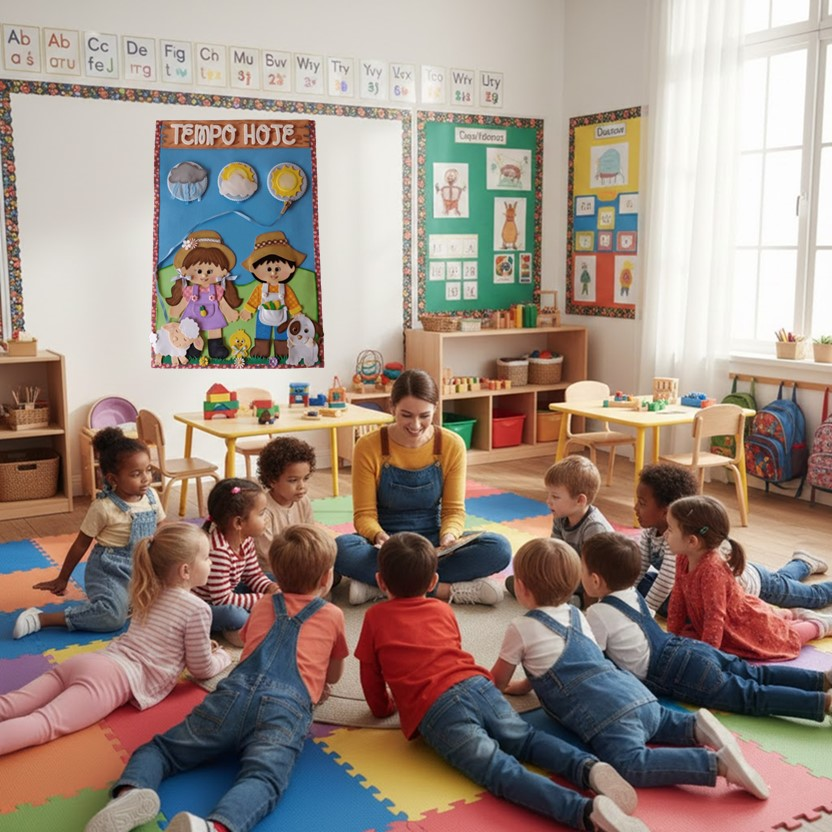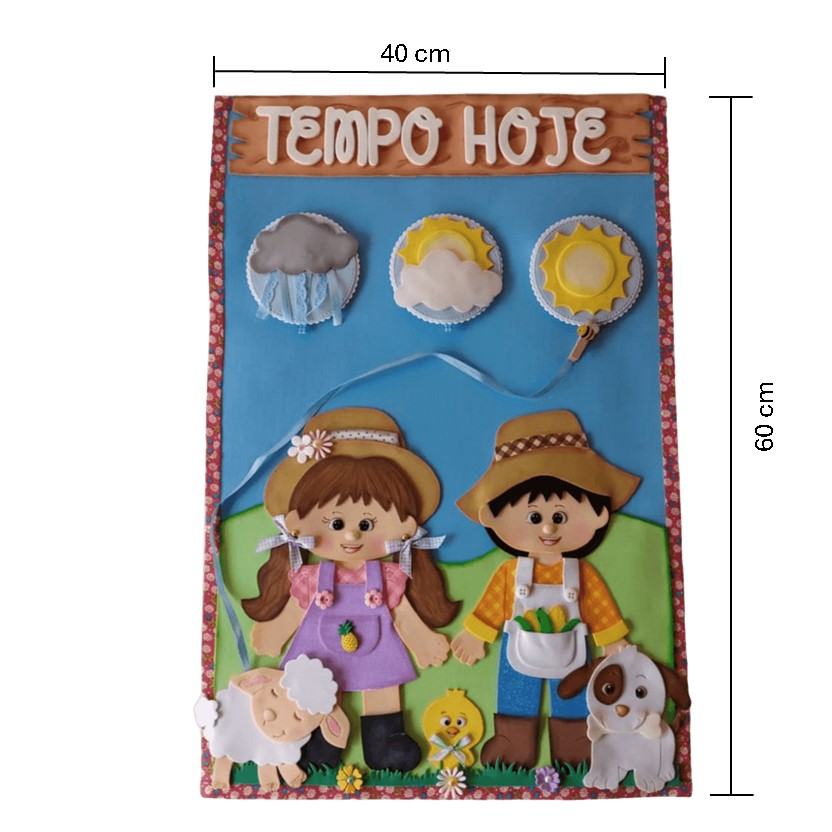 Kit Sala de Aula Fazendinha – Cartaz Tempo Hoje, recurso pedagógico em EVA (Emborrachado), usado como item na decoração.